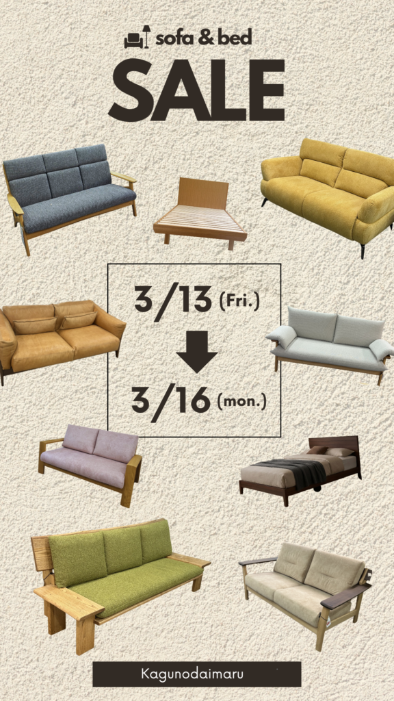 3/13(金)~3/16(月)の4日間限定で大人気のソファーとベッドがお得に手に入るセールを開催いたします🛋